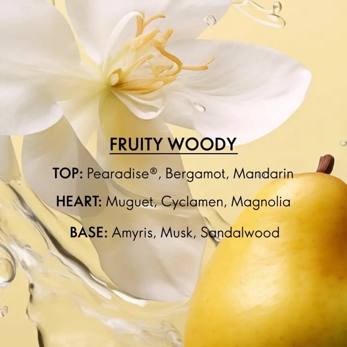با ترکیبی از گلابی تازه، مگنولیا و چوب صندل مشکدار، انرژی سرخوشی کشف را در آغوش بگیرید. رایحه اولیه: گلابی، ترنج، ماندارین رایحه میانی: گل برف، کوکب، مگنولیا رایحه پایانی: آمیریس، مشک، چوب صندل